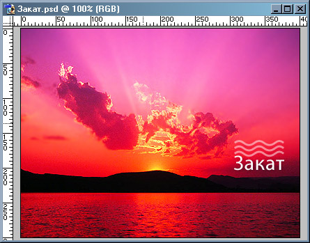 Чем, вы можете спросить PSD лучше TIFF? Ответ прост, в этом формате хранится информация о вашей работе в Photoshop, вот, например, небольшая тень под словом закат, вы очень просто можете ее изменить, но если бы это был другой формат, вам бы пришлось попотеть для получения того же результата.