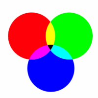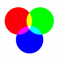 На рисунке показано, как смешиваются цвета, например, красный + зеленый, дает желтый, а красный + синий, даст фиолетовый. При равной интенсивности всех трех цветов, получаются градации серого, при максимальной яркости - белый, при отсутствии - черный.